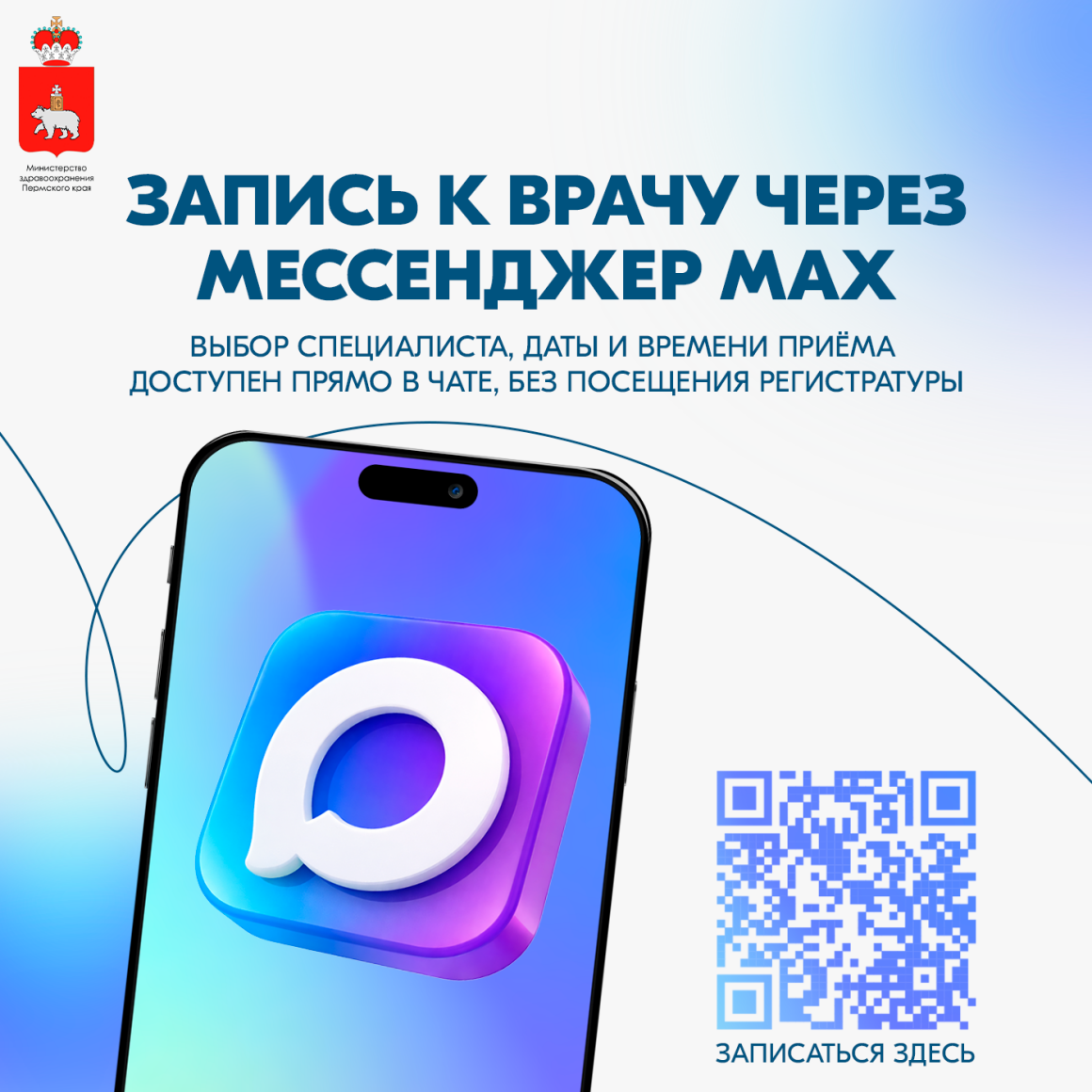 Воспользоваться чат-ботом можно по QR-коду или по ссылке. Для авторизованных пользователей в MАХ бот сам определит поликлинику, к которой прикреплен гражданин и предоставит возможность записаться к нужным врачам. Чат-бот полностью интегрирован с расписанием Единой информационной системы здравоохранения Пермского края.