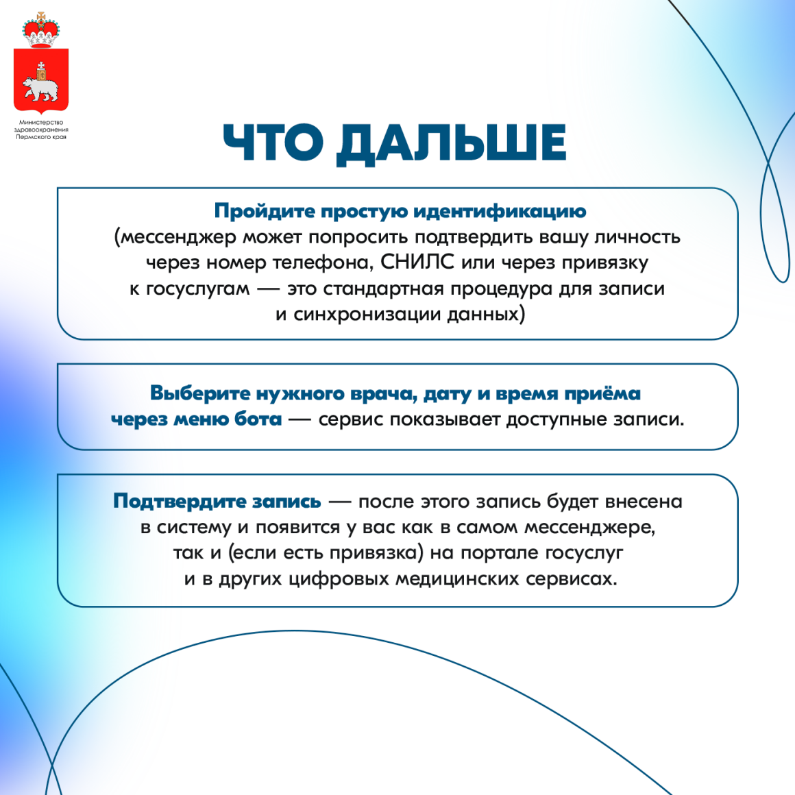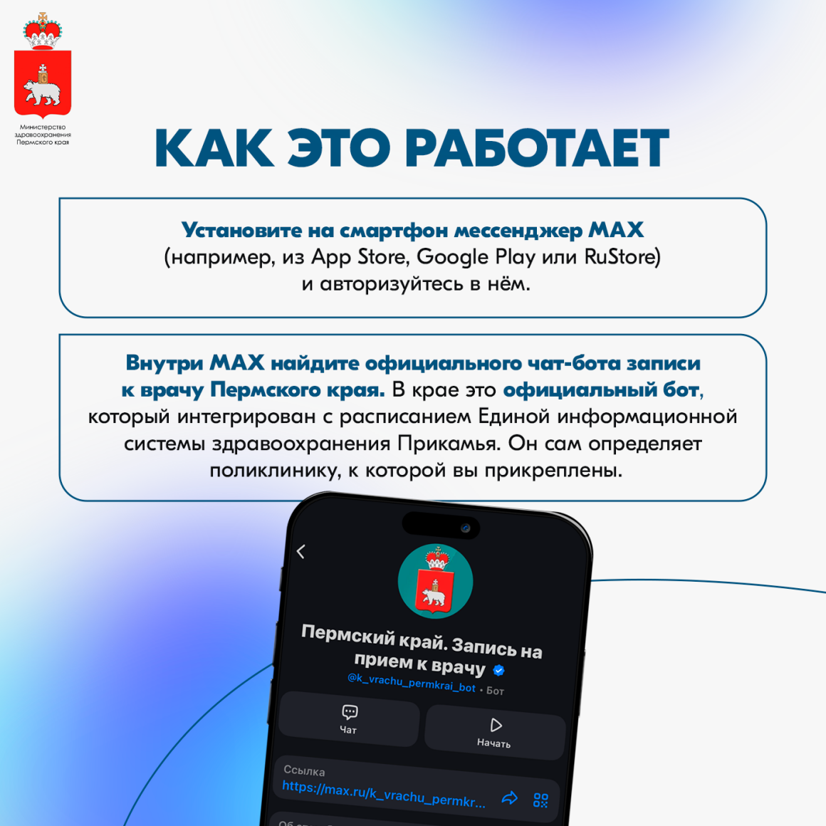 У жителей Пермского края появился еще один способ для дистанционной записи на прием к врачу. Помимо Госуслуг и регионального портала «К врачу», запущен официальный бот в национальном мессенджере МАХ.